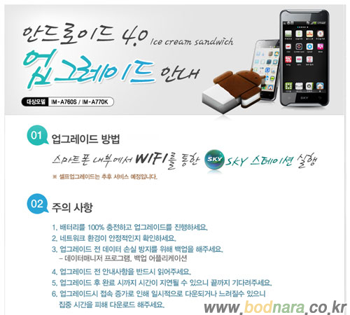 팬택은 2일 홈페이지를 통해 자사의 스마트폰 베가 레이서 SKT용 모델(IM-A760S)와 KT 모델(IM-A760K)에 대한 안드로이드 4.0 아이스크림 샌드위치 업그레이드(ICS)를 시작했다.